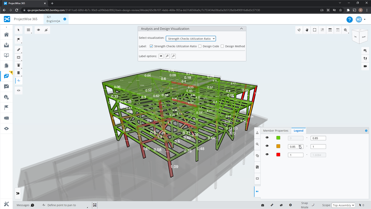 Utilization Ratios display demand/capacity % of members shown on screen. Members that have not been designed or assigned a ratio are greyed out.