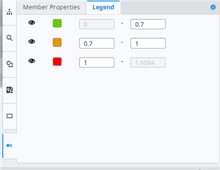 Strength Check Utilization Visualization in particular offers additional editable "Legend" tab to allow the customization of the bounds and corresponding visualization colors for the ranges. Utilization ratios greater than 1 are fixed to Red.