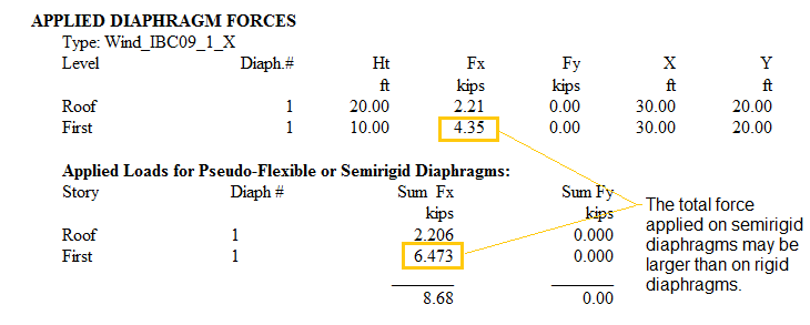 Additionally, when the diaphragm is semirigid, this can affects the building natural frequency which, in turn, can affect the wind gust factors and pressures and total forces. It may be better to manually input the structure frequency when using semirigid diaphragms.