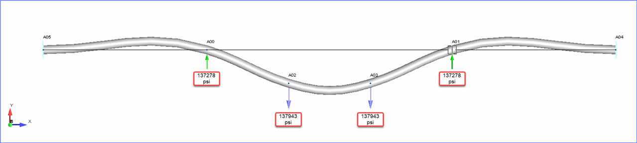 AutoPIPE will analyze the entire model and report results at node points. By Adding / removing node points to the model will calculate a new set of results, of which the maximum could now be higher than originally reported. Example, after looking at the displacement animation of this model imaged above, most stress engineers would surmise that stresses would be higher than currently reported between A02 and A03. Correct, after adding a node point at the center between A02 and A03, the reported stresses was found to be 138112 psi
