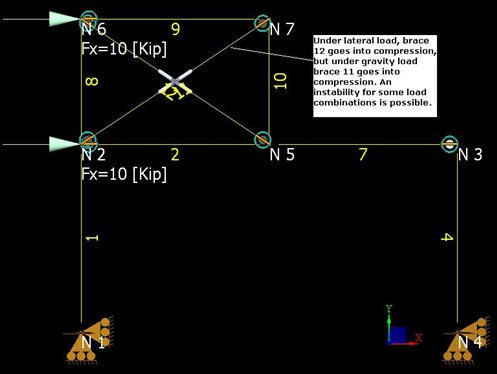 When a model utilizes non-linear members or springs most FEA applications iteratively solve for each load case and load combination. On each iteration, if a tension-only member is found to go into compression, that member is thrown out of the analysis and a new iteration is started. If too many of the members go into compression, the frame or structure as a whole can become instable.