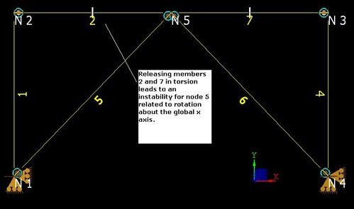 Take the case of a single member fixed at the base for all 6 DOF similar to a flagpole. This structure is stable, except that the free end of member away from the support is hinged or released for major axis bending. As a result, node 2 can spin about the global z axis.