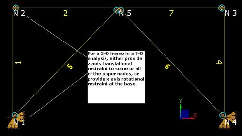 Often it is desirable to analyze a 2-dimensional frame using a 3-dimensional analysis. In some applications there is plane frame option that can be used to ignore the deflection out of plane (e.g. z axis) or rotation about the other axes, but if not, the frame can generally be stabilized one of two ways.
