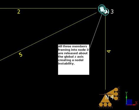For some applications, this type of "nodal instability" will terminate the analysis. For other applications, a small stiffness may be automatically assigned to the z axis rotational stiffness of the node and you may only get a warning, so long as a moment about the z axis is not applied directly to node 2. This would cause infinite rotation of the node and should terminate any analysis.