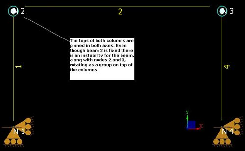 In this case we have a fixed ended beam setting on two columns, both of which are released at the top node. This case differs slightly from Case 2 because the nodes are fixed to the beam and not themselves instable. The problem is that the beam along with both top nodes can spin as a group on top of the columns similar to a log on water. This is an example of why it is usually better to keep the tops of the columns fixed and release the beams.