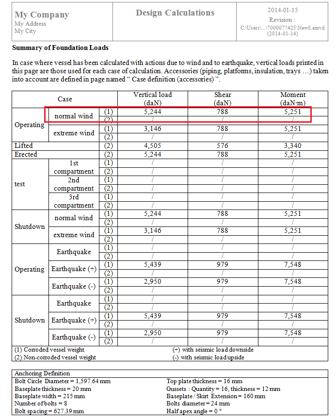 in the table above, the Vertical loads, Shear and Moment can be obtained from the corresponding load case (Operating, Normal wind case) calculation page in the report as shown below: