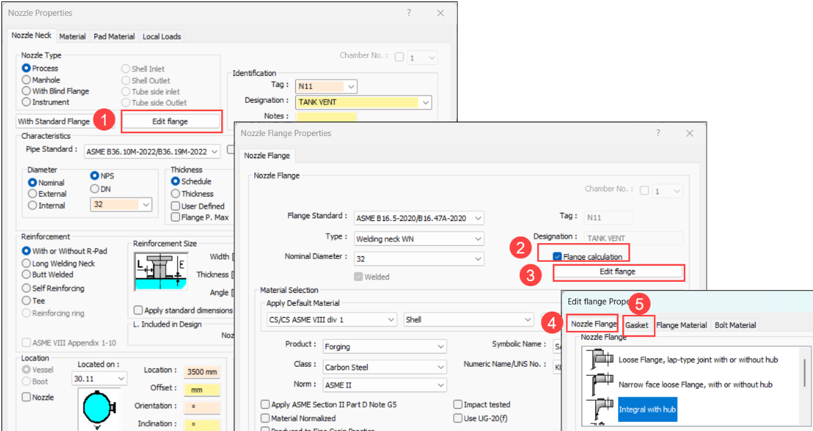 However, if you choose to fully design the flange, the gasket type and material will impact the calculations, which is not the case with standard flanges. Another words, the schedule of the nozzle does not affect the flange rating. Additionally, the gasket has no effect on the nozzle schedule. However, if you are using a welding neck flange, the thickness of the hub connecting to the nozzle will match the nozzle's thickness.
