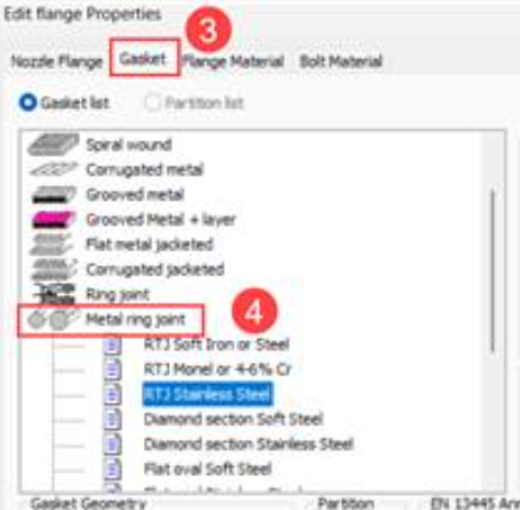 To perform flange calculations using standard flange dimensions and your preferred gasket type and material, check the Flange Calculation box in the Nozzle Flange dialogue box, then select Edit Flange and choose your Ring Joint gasket. This will enable the flange calculations. Please refer to the image below.