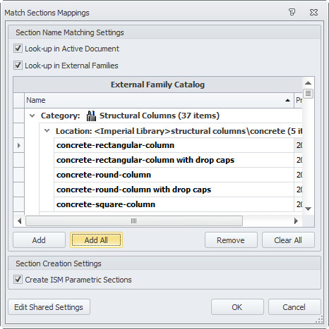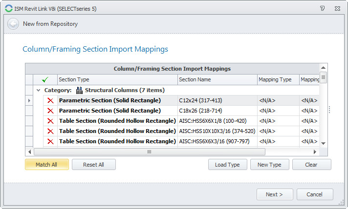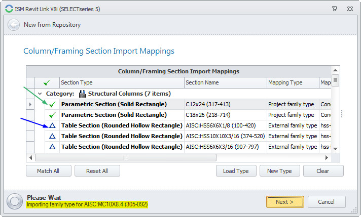 Now in the Column/Framing dialog all of the red X’s have turned to either green checks or blue triangles. The green check means the element has been matched to a shape already contained in the Revit model. The blue triangle means that the element has been matched to an external family file and that shape has to be imported before it can be used in the model.