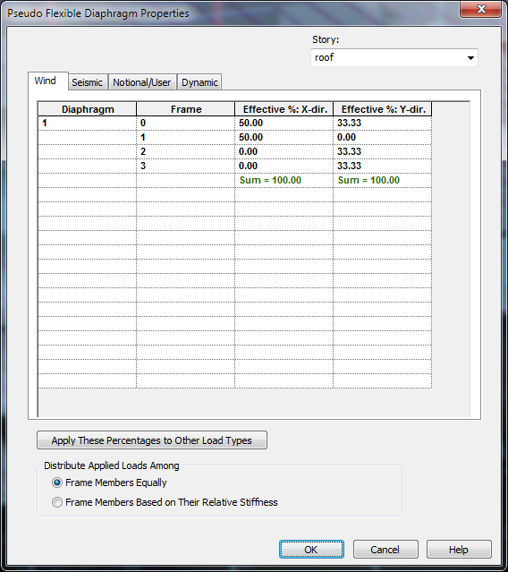In order for the program to distribute diaphragm force totals to specific frames according user defined percentages, Frame Numbers must be assigned. Once frame numbers are assigned they will appear in the Loads - Pseudo-Flexible Diaphragm Properties dialog.