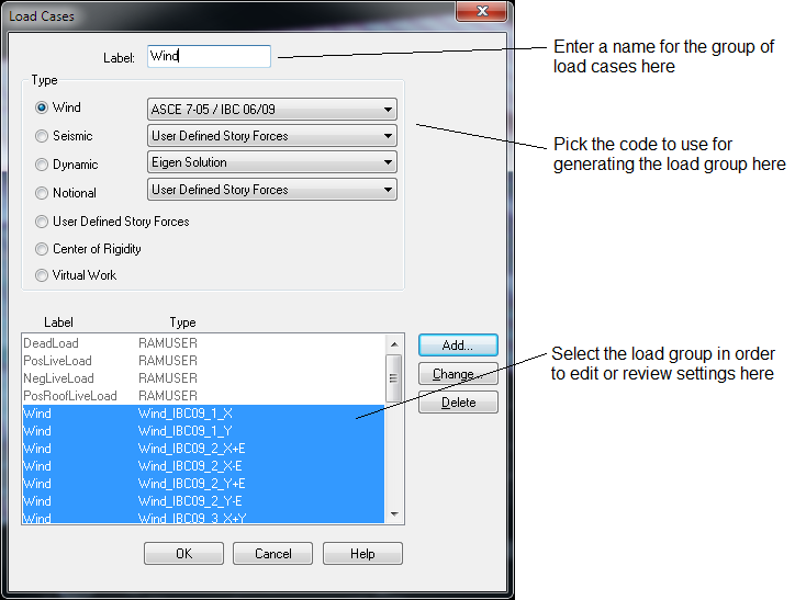 Larger collections of loads are grouped into subgroups. For example IBC wind loads are grouped as follows: