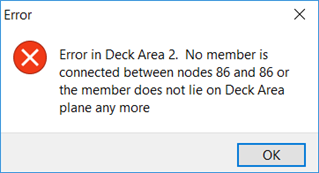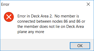 There are problems with the node that define the deck area. For example, there may be a duplicate node or an intermediate node along the member may be missing.
