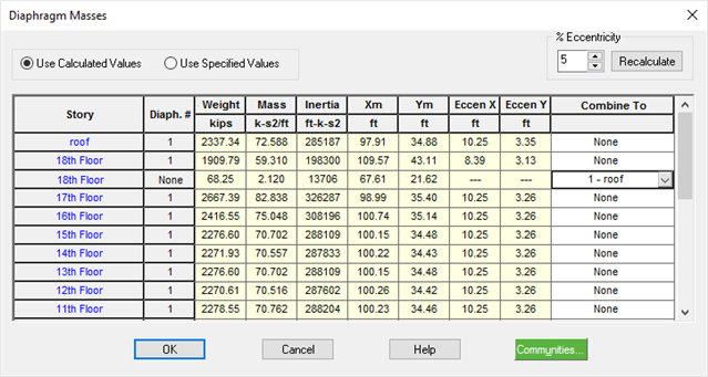 The error can also occur when there is an extreme inequality between the mass and stiffness at different levels. In buildings with partial levels, this is common, as there are some levels that do not have many lateral members framing to the diaphragm. Often, the mass for these levels is small, but highly eccentric in relation to the adjacent levels. Sometimes, the masses can be lumped with adjacent levels, either above or below, in order to simplify the model and allow the program to run. This can be done using the Loads - Masses command, and changing the value in the Combine cell for such levels.
