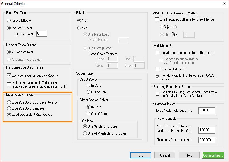 In version 15.00 a third option for performing the Eigenvalue analysis (periods and modes) was added, Lanczos Eigenvalue solver. The new solver has some remarkable advantages over the other two solutions: the new solver is faster than other two solutions (i.e., subspace iteration and Ritz vectors solution) and it consumes significantly less memory and it is a very robust solution (the Lanczos implementation is an open source code developed by Rice University and widely used in academia and in industry).
