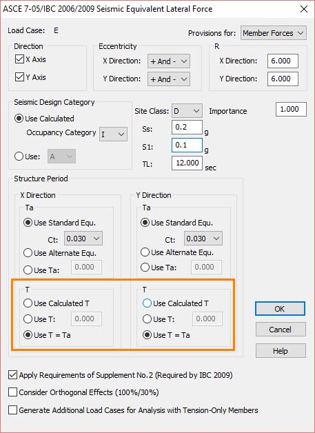 For seismic loads, this is done by setting T=Ta (or "Use Method A" in the UBC code) under the "T" heading in the load case definition (see illustration). The program will then use the approximate period of the building, and will not have to calculate the modes. If you analyze the building using the approximate period, you can observe the deflection at each level, and also review the loads and applied forces so that you can see how much load is being applied at each level.