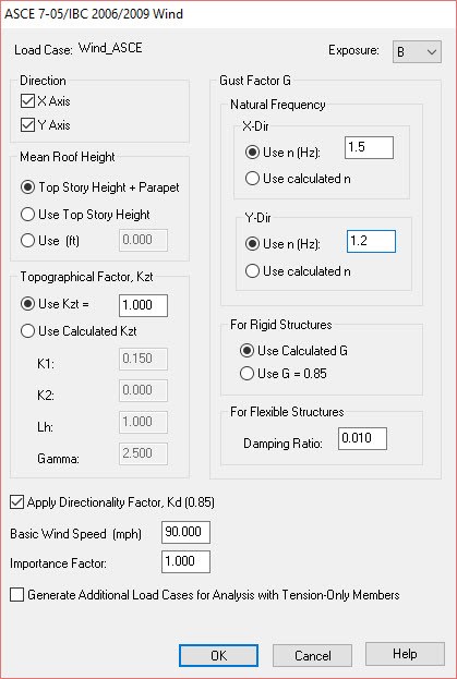 For wind loads per IBC or ASCE, the same type of thing can be done in relation to the building frequencies. Set the frequency of the building in both directions to n=1 Hz (or some other estimated value) and also set the Gust Factor = 0.85 to avoid having wind loads which require an eigen solution (see illustration).