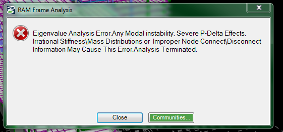 In version 14.06.00, an alternate method for calculating modal results using Ritz vectors was added as a feature in RAM Frame. Ritz vectors use an approximate method that produces results that are the same or nearly the same as the Eigen analysis. Generally, Ritz vectors are faster and more reliably converge to the solution. Because Ritz vectors converge more reliably, they are another tool that can be used to resolve Eigenvalue errors.
