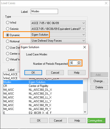 A model will sometimes run with a reduced number of modes. The program default is to solve 3 modes per rigid diaphragm in the model. The first 3 modes are typically the controlling modes so running the analysis with fewer modes may be acceptable. To do this create a new load case called "Modes" of the type, Dynamic - Eigen Solution. When you click [Add] you will be prompted to select the desired number of modes (see illustration).