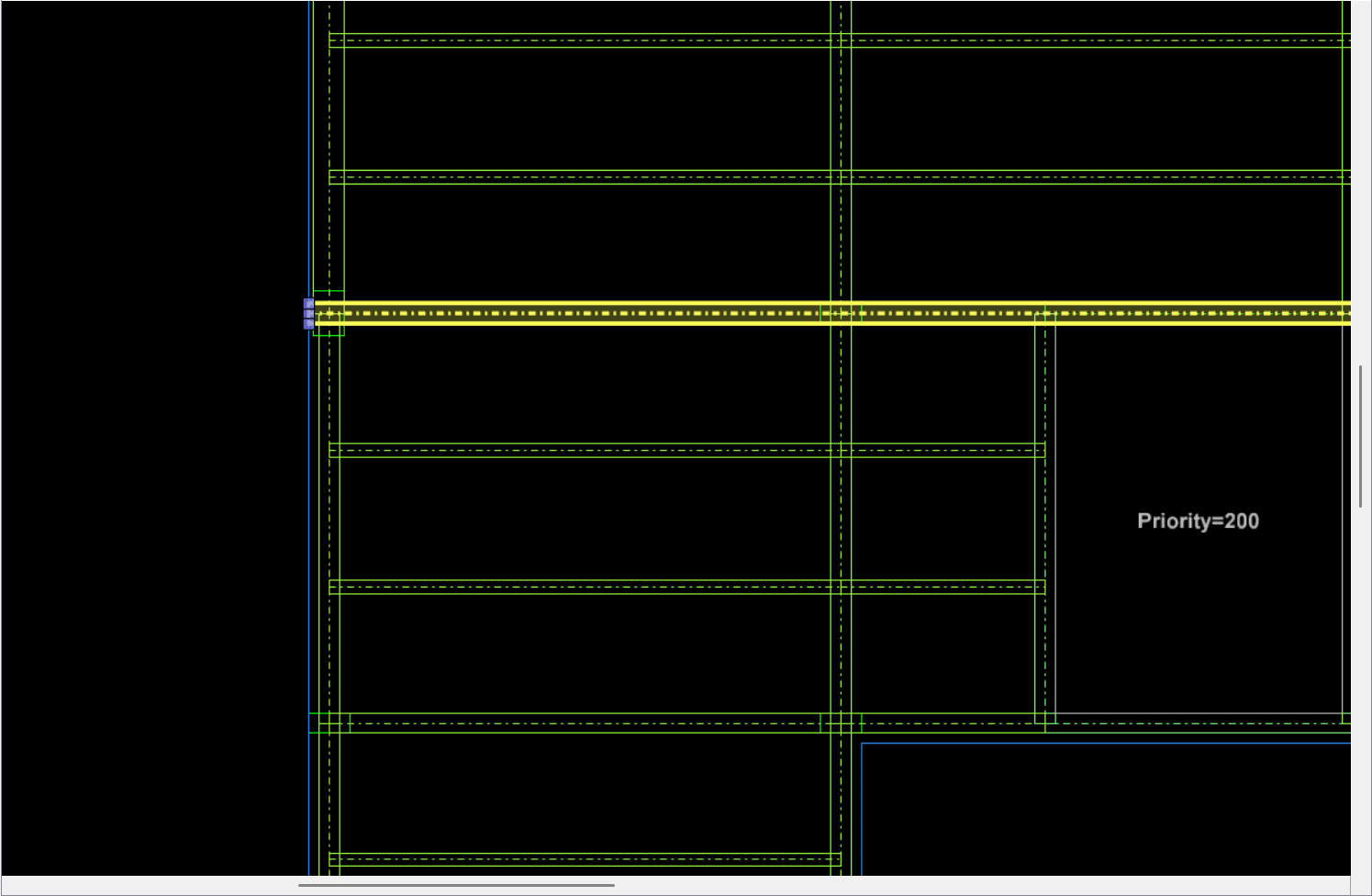 Beams in RAM Concept are meshed with the slab. For continuous beams modeled in RAM Concept, it is not necessary to model the beams in segments from column to column. Meshing problems are often prevented by modeling continuous beams as one beam segment from outside face of the first column to the outside face of the last column bypassing each intermediate column. Beams modeled in RAM Structural System are modeled support to support. When the beams are imported into RAM Concept, they are brought into the program as segmented members between each support. In most cases, there will be multiple overlapping areas at the column (see Figure1 below). Since this can produce meshing errors in some cases, it is often easier to not import beams and then create them in RAM Concept after the model is imported and modeling as a continuous beam (see Figure 2 below).