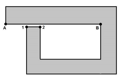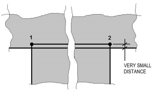 The magnitude of the dimension Very Small Distance is on the order of 0.01" (0.25 mm) or less. The defect manifests only if both point 1 and point 2 are within Very Small Distance of the adjacent segment, and do not lie directly on the segment.
