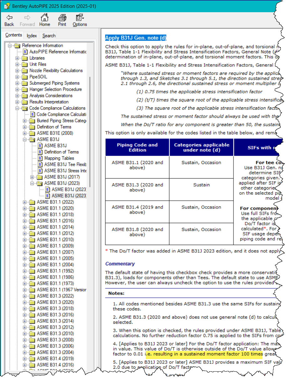 For some codes (ex. B31.3), the SIF calculations have only been validated for a certain range of pipe sizes. For any pipe size out side of the range, the SIF calculations may not be valid. Let us consider an example, using ASME B31.3 2016, see Flexibility and Stress Intensification on table D300 and refer to General Note: