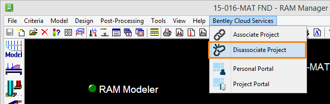In Ram Manager use the Bentley Cloud Services menu option to Disassociate Project from the model. You will need to be signed in to Bentley CONNECT in order for the options in the Bentley Cloud Services menu to be active. The Sign In link is in the upper right corner of the RAM Manager window.