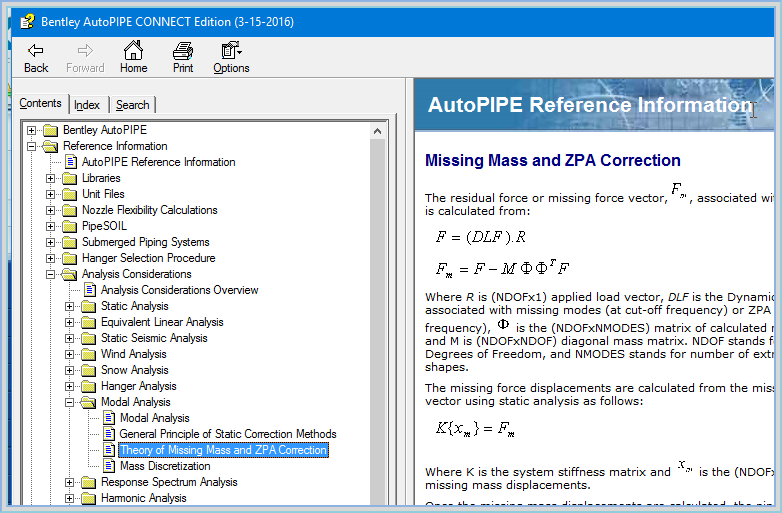 For more information on using Static Correction Methods, go to the AutoPIPE Help, Help > Contents > Contents Tab > Reference Information > Analysis Considerations > Modal Analysis > General Principle of Static Correction Methods and theory of Missing Mass and ZPA Correction.
