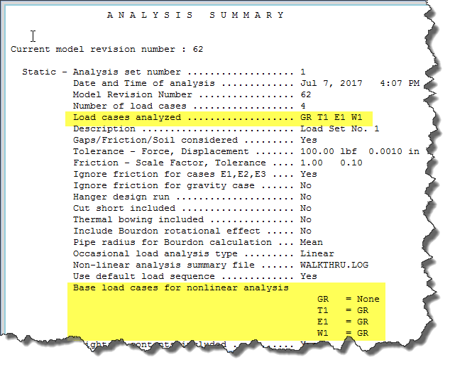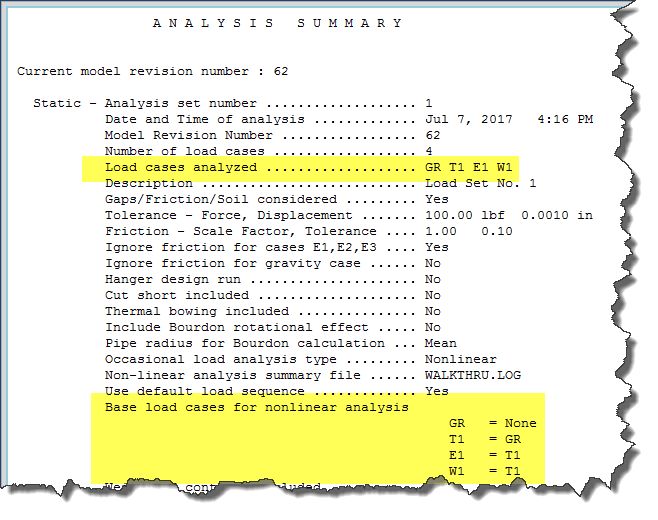 Here one can clearly see that the Load Cases analyzed are Gr, T1, E1, and W1. Also that the load sequence was: