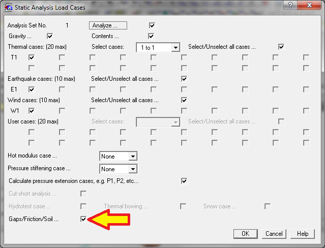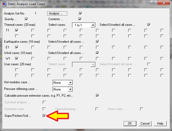 Select an Analysis set and press the Modify button to open the dialog. Where he option "Gaps/Friction/Soil" can be enabled / disabled as needed and press OK button.