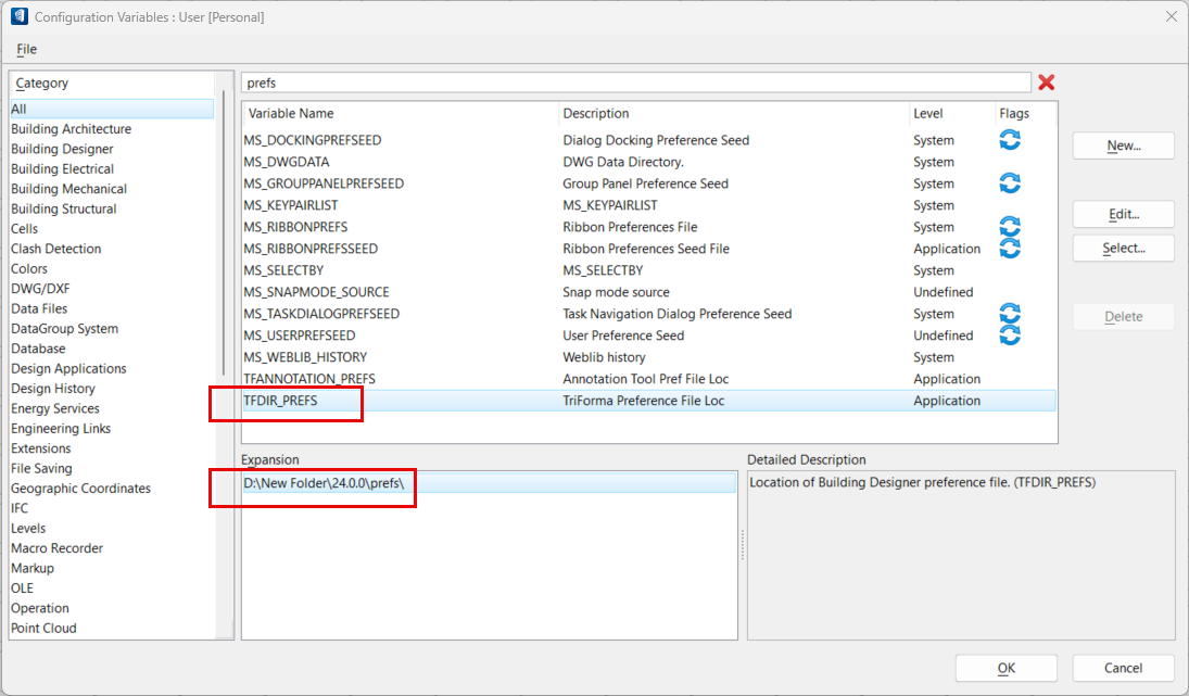 7. Launch OBD 2024 and check the Configuration Variable "TFDIR_PREFS" to make sure that you are directed to the correct prefs folder.