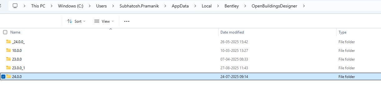 2. Go to "C:\Users\Your.Name\AppData\Local\Bentley\OpenBuildingsDesigner\" and copy the folder named "24.0.0" if you are using OBD 2024.