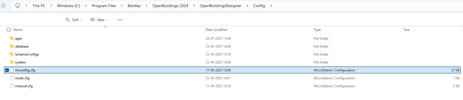 4. Go to "C:\Program Files\Bentley\OpenBuildings 2024\OpenBuildingsDesigner\Config\" and open the file named "msconfig.cfg" using any text editor like Notepad or Notepad++ etc.